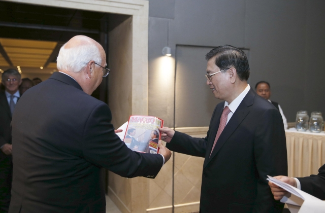 ??? 希門內(nèi)斯將最新一期《宏觀經(jīng)濟》送給張德江委員長。1972年希門內(nèi)斯首次訪華,是時任墨西哥總統(tǒng)埃切維里亞的新聞官。他后來多次到中國參觀考察,親眼目睹了中國的巨大變化。他說原來的北京是個“矮城”,樓不高,車輛少,步行的人多?,F(xiàn)在的北京“已成為高樓林立的現(xiàn)代化大都市”。