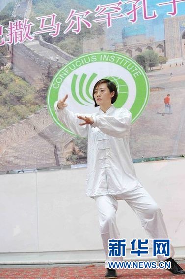????11月27日,烏茲別克斯坦撒馬爾罕國立外國語學(xué)院禮堂,上海外國語大學(xué)李海榮老師在表演太極拳。(新華網(wǎng)記者 沙達提 攝)