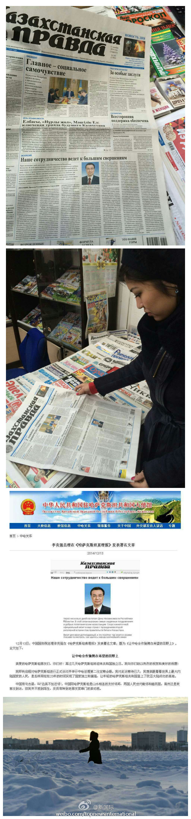 ????新華網(wǎng)北京12月13日電? 據(jù)新華社“新國(guó)際”微博報(bào)道,哈薩克斯坦真理報(bào)13日頭版刊登李克強(qiáng)總理訪前發(fā)表的署名文章《讓中哈合作馳騁在希望的田野上》??偫肀硎荆泄怯押绵彴?,歷史淵源深厚,戰(zhàn)略互信不斷加深,利益融合愈加緊密,他對(duì)中哈合作未來充滿信心。李克強(qiáng)還就即將到來的哈薩克斯坦獨(dú)立日向當(dāng)?shù)孛癖娭乱宰YR和祝愿。