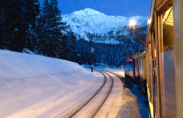 ?。▽?zhuān)列在暮色中即將抵達(dá)達(dá)沃斯,窗外白雪皚皚,昏黃的燈光感覺(jué)很溫暖。攝影:王威)