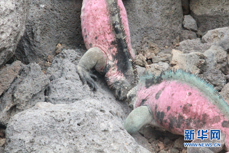 兩只佛羅雷阿納島上的海鬣蜥在爭奪地盤。到了繁殖期的海鬣蜥皮膚會呈現(xiàn)出大紅大綠的顏色,情緒也會高漲起來。