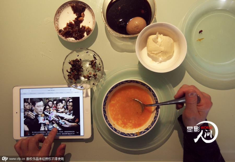2014年3月11日,山東濟南,一名市民一邊吃著早餐,一邊翻閱IPAD,關注失聯(lián)航班MH370的最新動態(tài)。