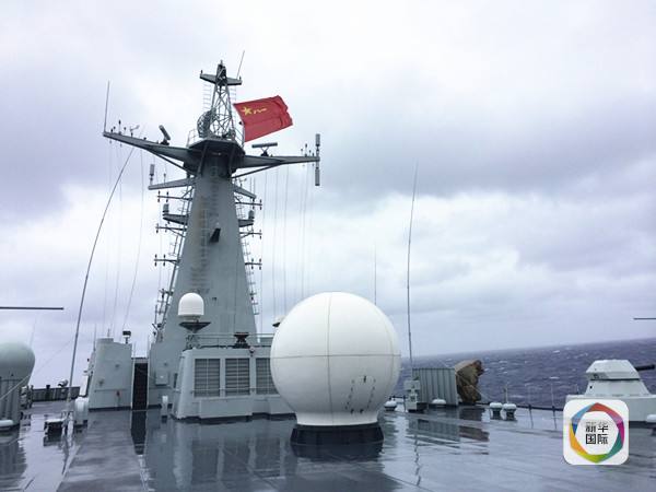 這是2014年4月23日拍攝的在風浪里堅持執(zhí)行搜索任務(wù)的中國海軍井岡山艦。(新華社記者白瑞雪攝)