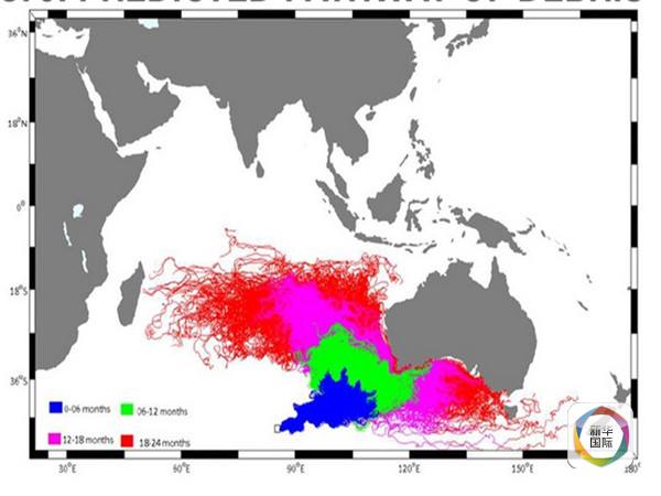 根據(jù)這個(gè)模型,MH370的殘骸可能在18-24個(gè)月出現(xiàn)在下圖中的紅色區(qū)域,法屬留尼汪島就在紅色區(qū)域內(nèi)。