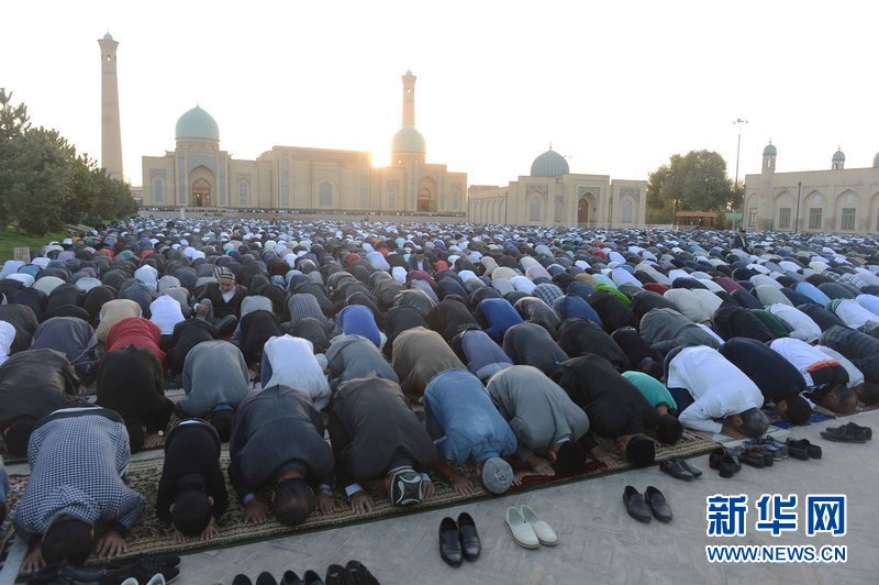 ?。乖拢玻慈眨跒跗潉e克斯坦首都塔什干哈斯特·伊瑪姆建筑群清真寺廣場,人們參加古爾邦節(jié)禮拜。當天,烏茲別克斯坦各地慶祝伊斯蘭教傳統(tǒng)節(jié)日古爾邦節(jié)?!肮艩柊罟?jié)”亦稱“宰牲節(jié)”,是伊斯蘭教三大節(jié)日之一。 新華社記者沙達提 攝