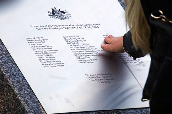 ↑2015年7月17日,在澳大利亞堪培拉議會大廈外,一名馬航MH17空難罹難者家屬撫摸紀念碑。