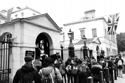 10月16日,在英國(guó)倫敦皇家騎兵衛(wèi)隊(duì)檢閱場(chǎng),正門外已掛出大幅中英兩國(guó)國(guó)旗,往來(lái)游人與身穿傳統(tǒng)制服的衛(wèi)隊(duì)哨兵合影留念。20日,為前來(lái)英國(guó)進(jìn)行國(guó)事訪問的習(xí)近平主席舉行的歡迎儀式將在這里進(jìn)行?,F(xiàn)場(chǎng)將鳴放21響禮炮,女王伊麗莎白二世與其丈夫愛丁堡公爵菲利普親王將陪同習(xí)近平主席檢閱英國(guó)皇家儀仗隊(duì)。隨后,女王夫婦將陪同習(xí)近平主席夫婦從這里乘坐皇家馬車前往白金漢宮,并共進(jìn)午宴。 本報(bào)駐倫敦記者 戴軍攝