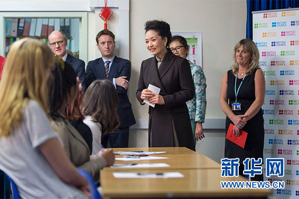 在英國(guó)教育部國(guó)務(wù)大臣吉布、學(xué)校校長(zhǎng)等陪同下,彭麗媛觀看學(xué)生們用中文進(jìn)行的才藝表演,參觀學(xué)校成果展,觀摩中文課,與女學(xué)生們互動(dòng)交流,并向?qū)W校贈(zèng)送中國(guó)文化及漢語(yǔ)學(xué)習(xí)類圖書(shū)及音像制品。