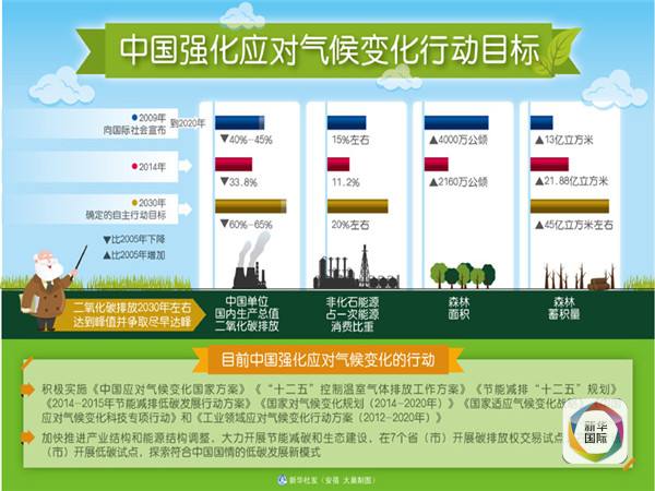 今年6月,中國正式向聯(lián)合國提交2020年后應(yīng)對氣候變化的“國家自主決定貢獻(xiàn)”:二氧化碳排放2030年左右達(dá)到峰值并爭取盡早實現(xiàn),單位國內(nèi)生產(chǎn)總值二氧化碳排放比2005年下降60%至65%,非化石能源占一次能源消費比重達(dá)到20%左右,森林蓄積量比2005年增加45億立方米左右。