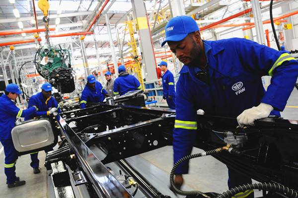 2014年7月10日,中國(guó)第一汽車集團(tuán)在南非東開(kāi)普省曼德拉灣市舉行南非庫(kù)哈工廠落成及首輛機(jī)車下線儀式。圖為工人在中國(guó)一汽南非工廠生產(chǎn)線上工作。 (新華社記者張川石攝)