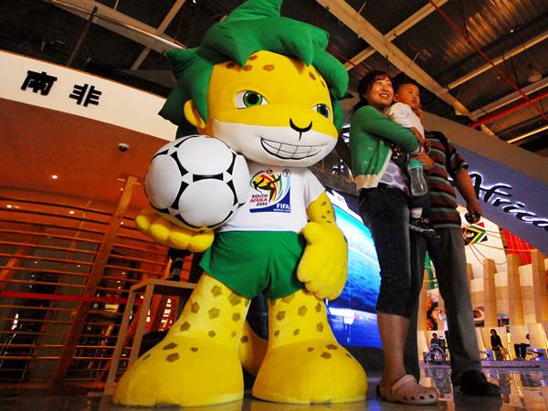 2010年5月7日,游客在世博園南非館與世界杯吉祥物“扎庫(kù)米”合影。