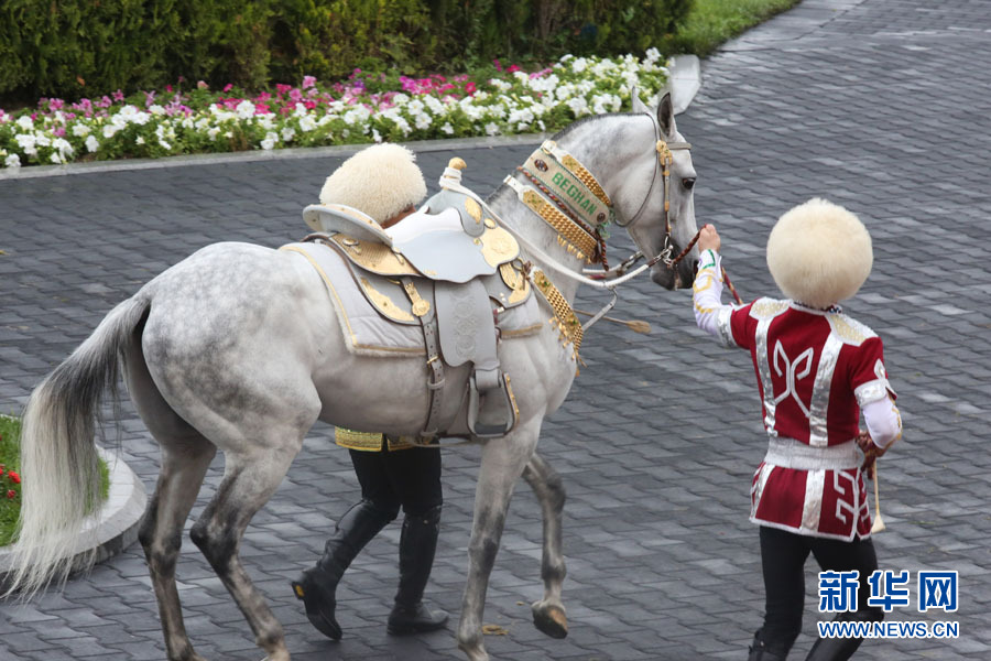 4月23日在土庫曼斯坦首都阿什哈巴德拍攝的獲得2016年度“最美汗血馬”稱號的“別格汗”。新華網(wǎng)記者 盧敬利 攝