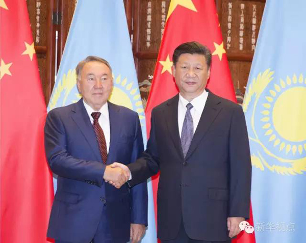 (國家主席習(xí)近平同哈薩克斯坦總統(tǒng)納扎爾巴耶夫舉行會(huì)談。新華社記者丁林 攝)