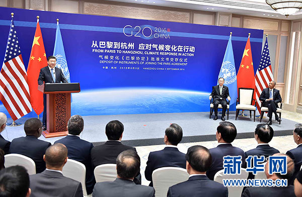??? 9月3日,國(guó)家主席習(xí)近平同美國(guó)總統(tǒng)奧巴馬、聯(lián)合國(guó)秘書(shū)長(zhǎng)潘基文在杭州共同出席氣候變化《巴黎協(xié)定》批準(zhǔn)文書(shū)交存儀式。 新華社記者李濤攝