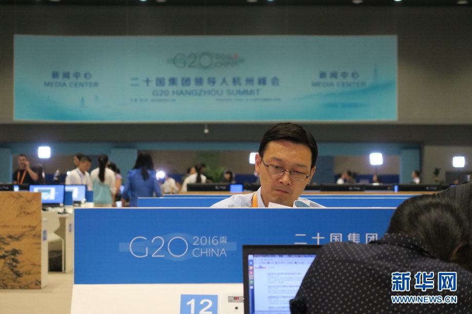 二十國集團(tuán)領(lǐng)導(dǎo)人第十一次峰會9月4日至5日在浙江杭州舉行。峰會新聞中心一派繁忙景象,境內(nèi)外各路媒體記者使出“洪荒之力”,實(shí)時報道峰會動態(tài)。新華網(wǎng)記者 陳競超 攝