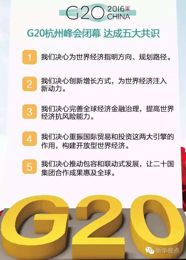 從4日下午,習(xí)近平主席敲下木槌,宣布峰會(huì)開幕,至5日下午峰會(huì)閉幕。一天半的時(shí)間,領(lǐng)導(dǎo)人在峰會(huì)上圍繞會(huì)議主題和重點(diǎn)議題進(jìn)行了熱烈而富有成果的討論,就加強(qiáng)政策協(xié)調(diào)、創(chuàng)新增長(zhǎng)方式,全球經(jīng)濟(jì)金融治理,國(guó)際貿(mào)易和投資,包容和聯(lián)動(dòng)式發(fā)展等議題,以及影響世界經(jīng)濟(jì)的其他突出問題,深入交換看法,達(dá)成許多重要共識(shí)。