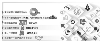 專家預(yù)測,到2050年全球能源互聯(lián)網(wǎng)初步建成時,清潔能源比重將達(dá)到80%,每年可替代相當(dāng)于240億噸標(biāo)準(zhǔn)煤的化石能源,減排二氧化碳670億噸。屆時,全球溫升控制在2攝氏度以內(nèi)的目標(biāo)有望實現(xiàn)。這一發(fā)展低碳經(jīng)濟、實現(xiàn)能源變革轉(zhuǎn)型的系統(tǒng)性解決方案,贏得潘基文、世界銀行行長金墉、美國能源部長莫尼茲等的高度贊賞和積極支持。