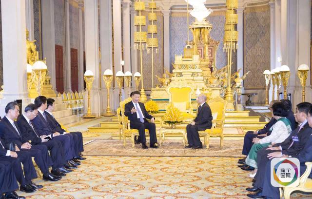 習(xí)近平在金邊會(huì)見(jiàn)柬埔寨國(guó)王西哈莫尼。(新華社記者謝環(huán)馳攝)
