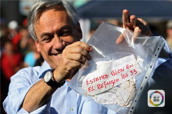 事故發(fā)生后第二天,時任智利總統(tǒng)皮涅拉承諾,政府將“竭盡全力”營救被困礦工。8月22日,經過17天的鉆探搜尋,地面通往井下的生命通道被打通。鉆頭縮回后,礦工奧赫達傳回地面的字條立刻傳遍了世界:我們33人都在庇護所內,全部安好。