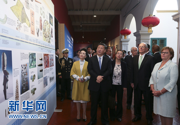 閉幕式后,習(xí)近平和彭麗媛同庫(kù)琴斯基夫婦共同參觀“天涯若比鄰-華夏瑰寶展”。
