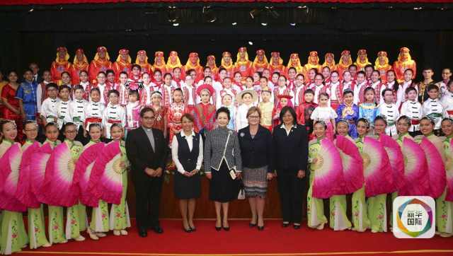 ??? 在學校禮堂,彭麗媛觀看學生文藝演出。學生們表演了合唱《歌聲與微笑》《在希望的田野上》,中秘兒童服裝表演、武術和扇子舞等。演出結(jié)束后彭麗媛與全體演員合影,感謝他們的精彩演出。