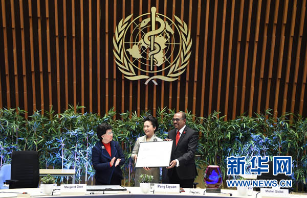 ??? 1月18日,國(guó)家主席習(xí)近平夫人、世界衛(wèi)生組織結(jié)核病和艾滋病防治親善大使彭麗媛應(yīng)世界衛(wèi)生組織總干事陳馮富珍和聯(lián)合國(guó)艾滋病規(guī)劃署執(zhí)行主任西迪貝邀請(qǐng),在瑞士日內(nèi)瓦出席為她舉行的親善大使任期續(xù)延暨頒獎(jiǎng)儀式。這是世界衛(wèi)生組織總干事陳馮富珍向彭麗媛頒發(fā)世衛(wèi)組織榮譽(yù)勛章。新華社記者謝環(huán)馳攝