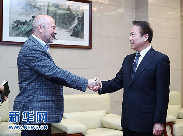 6月6日,新華社總編輯何平在北京會(huì)見(jiàn)今日俄羅斯電視臺(tái)執(zhí)行總編輯尼科洛夫。 新華社記者鞠鵬攝
