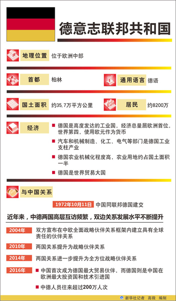 中國(guó)于1972年10月11日同聯(lián)邦德國(guó)建交。近年來(lái),中德兩國(guó)高層互訪頻繁,雙邊關(guān)系發(fā)展水平不斷提升。2004年,雙方宣布在中歐全面戰(zhàn)略伙伴關(guān)系框架內(nèi)建立具有全球責(zé)任的伙伴關(guān)系;2010年,兩國(guó)關(guān)系提升為戰(zhàn)略伙伴關(guān)系;2014年,兩國(guó)關(guān)系進(jìn)一步提升為全方位戰(zhàn)略伙伴關(guān)系。