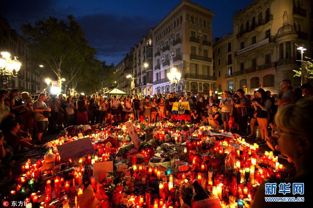 當?shù)貢r間2017年8月18日,西班牙巴塞羅那,當?shù)孛癖婞c燭獻花悼念恐襲事件遇難者。17日,一輛白色貨車在巴塞羅那市中心蘭布拉大道加泰羅尼亞廣場附近沖撞人群,據(jù)媒體報道,死亡人數(shù)已經升至14人。(圖片來源:東方IC)