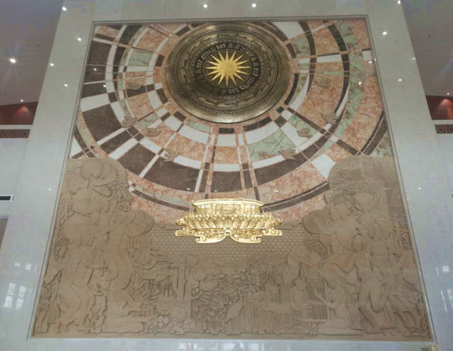 剛剛竣工的越中友誼宮,即將迎來一場盛大的落成移交儀式。記者抵達時,花匠們正在門口精心布置,用鮮花擺出中國和越南國旗的式樣。步入大廳,由中央美術(shù)學(xué)院歷時七個月設(shè)計的大型壁畫《山水相依 友誼長存》撲入眼簾——核心元素是中越古代共有的樂器“銅鼓”,寓意兩國文化交融源遠流長。畫面中下部是身著傳統(tǒng)服飾的中越民眾形象,或翩翩起舞,或引吭高歌,或手捧豐收果實,喜樂祥和中傳遞著中越之間濃厚的情誼。