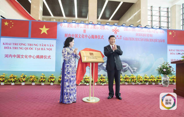 11月12日,中共中央總書記、國家主席習(xí)近平在河內(nèi)出席越中友誼宮落成移交儀式暨河內(nèi)中國文化中心揭牌儀式。這是習(xí)近平和越南國會(huì)主席阮氏金銀共同為中國文化中心揭牌。新華社記者李濤攝