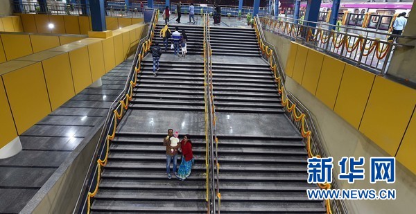 12月25日,在印度首都新德里洋紅色地鐵線,人們站在站臺臺階上駐足留影。當(dāng)日,連接新德里及其衛(wèi)星城諾伊達(dá)(Noida)之間的洋紅色地鐵線建成通車。這條線路全長12.64公里。德里地鐵公司計(jì)劃未來提高這條地鐵線路自動化水平,以“無人值守模式”運(yùn)行。目前,新德里運(yùn)營地鐵線路共有7條,分別用顏色命名,包括紅色、黃色、藍(lán)色、綠色、橙色、紫羅蘭和洋紅色。新華網(wǎng)發(fā) (張迺杰 攝)