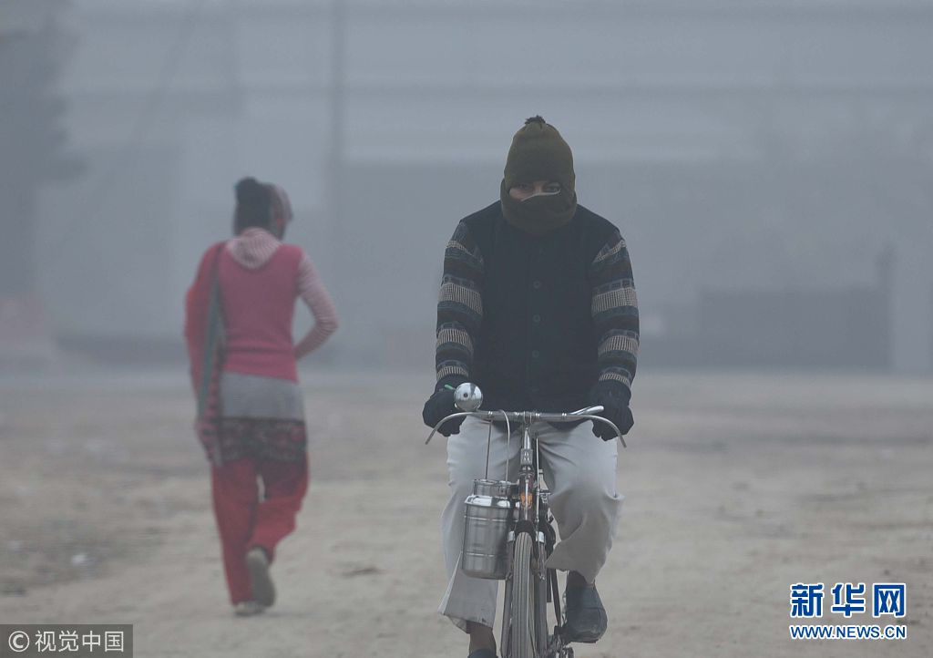 當(dāng)?shù)貢r間1月2日,印度新德里遭遇冷空氣及強(qiáng)霧霾天氣,能見度低。(圖片來源:視覺中國)