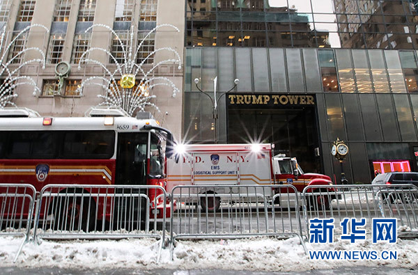 1月8日,消防車輛從美國紐約特朗普大廈外駛過。新華社記者 王迎 攝