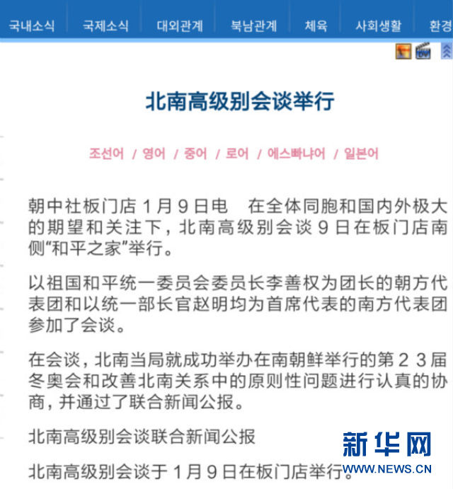 新華社平壤1月10日電(記者程大雨)在外界聚焦9日朝韓高級別會談之際,朝鮮官方媒體的反應(yīng)本身也令人關(guān)注。朝中社9日晚些時(shí)候播發(fā)了相關(guān)報(bào)道,而《勞動(dòng)新聞》和朝鮮中央電視臺10日分別轉(zhuǎn)引了朝中社報(bào)道。