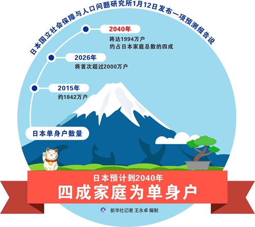 新華社東京1月13日電(記者華義)日本國(guó)立社會(huì)保障與人口問題研究所12日發(fā)布一項(xiàng)預(yù)測(cè)報(bào)告說,到2040年日本單身戶將占日本家庭總數(shù)的約四成。日本老齡化和獨(dú)居現(xiàn)象日益加劇。