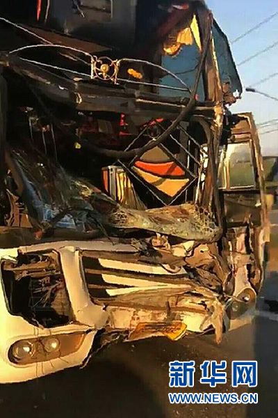 這是1月18日在泰國中部北柳府拍攝的與貨車追尾的大客車(手機(jī)照片)。新華社發(fā)