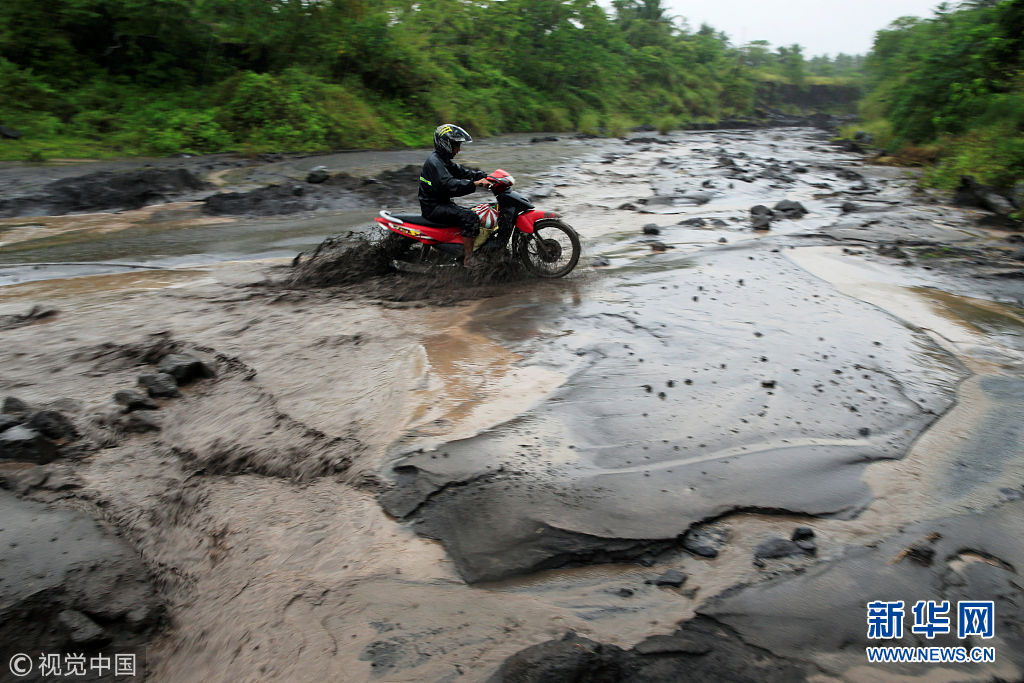 當(dāng)?shù)貢r(shí)間2018年1月27日,菲律賓阿爾拜省,民眾穿過(guò)混合著火山灰的泥漿河。(圖片來(lái)源:視覺(jué)中國(guó))