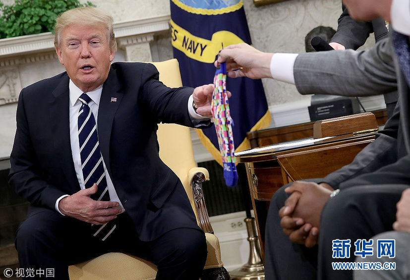 美國總統(tǒng)特朗普與公司職員討論稅改 獲贈一雙花襪子