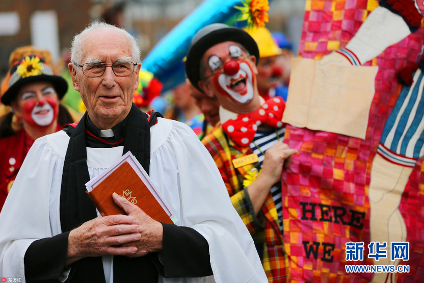 當(dāng)?shù)貢r(shí)間2月4日,英國(guó)倫敦,人們扮成小丑的模樣聚集在圣三一教堂,為英國(guó)“小丑之父”約瑟夫-格里馬爾迪(1778-1837)舉辦紀(jì)念會(huì)。(圖片來(lái)源:東方IC)