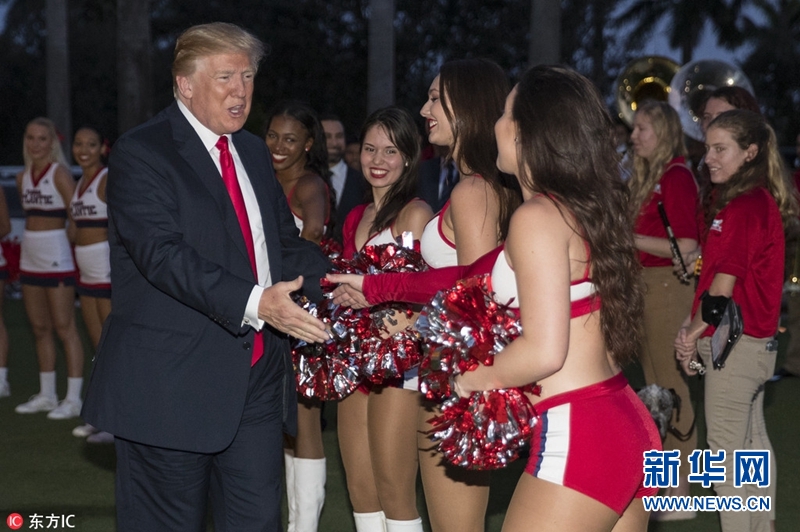 當(dāng)?shù)貢r(shí)間2018年2月4日,美國(guó)佛州西棕櫚灘,美國(guó)總統(tǒng)特朗普與第一夫人梅拉尼婭在高爾夫俱樂部觀看大學(xué)生樂隊(duì)的歡迎演出,與美女啦啦隊(duì)員握手。據(jù)悉,特朗普夫婦出席在該俱樂部舉辦的超級(jí)碗派對(duì)。(圖片來(lái)源:東方IC)