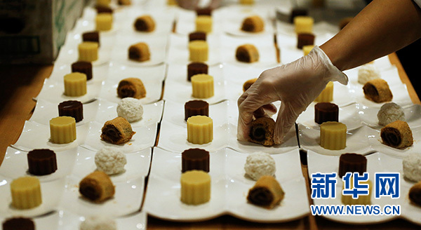 2月8日,在美國(guó)洛杉磯,廚師準(zhǔn)備傳統(tǒng)中式點(diǎn)心“驢打滾”、“艾窩窩”、“豌豆黃”和“紅豆涼糕”。 新華社記者 李穎 攝