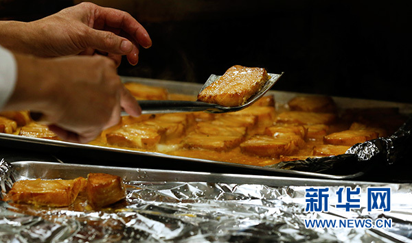2月8日,在美國(guó)洛杉磯,廚師制作烤鱈魚。 新華社記者 李穎 攝