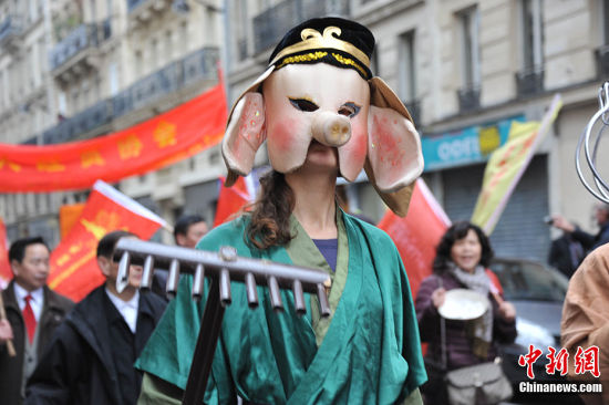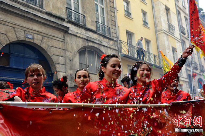 一群法國(guó)姑娘穿著唐裝,興高采烈的參加春節(jié)游行,喜感滿滿。