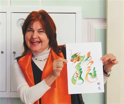 2月14日,莫斯科中國文化中心在中共六大會(huì)址常設(shè)展覽館舉辦了2018年新春聯(lián)誼會(huì)。圖為一位嘉賓展示中國民間藝人創(chuàng)作的龍形字畫。記者 張曉東攝