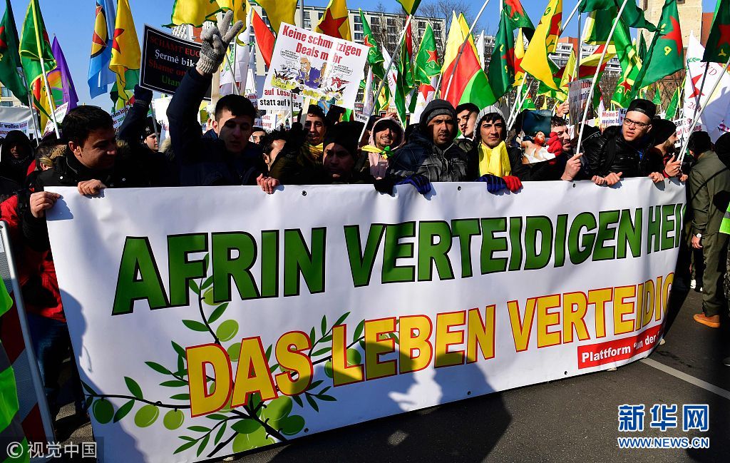 當(dāng)?shù)貢r間2018年3月3日,德國柏林,當(dāng)?shù)孛癖娕e行游行,抗議土耳其對敘利亞阿夫林地區(qū)的庫爾德人采取軍事行動。(圖片來源:視覺中國)