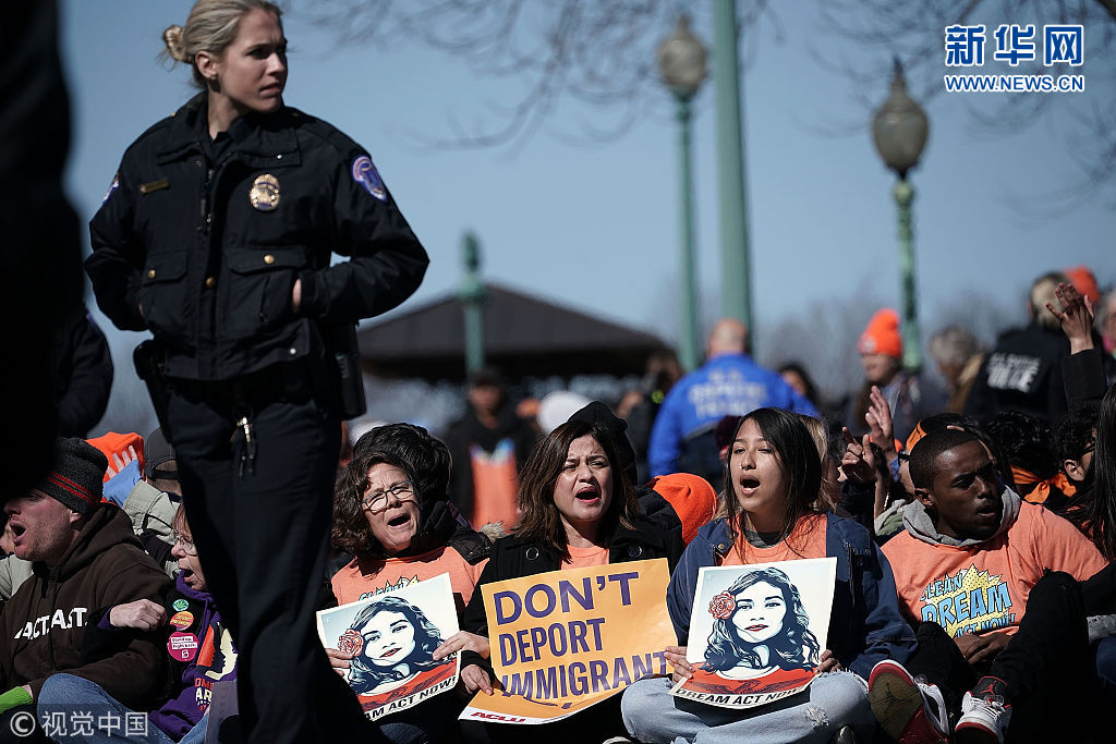 當(dāng)?shù)貢r(shí)間2018年3月5日,美國華盛頓,移民活動(dòng)家在國會(huì)山舉行集會(huì),抗議特朗普終結(jié)“夢(mèng)想法案”計(jì)劃。(圖片來源:視覺中國)
