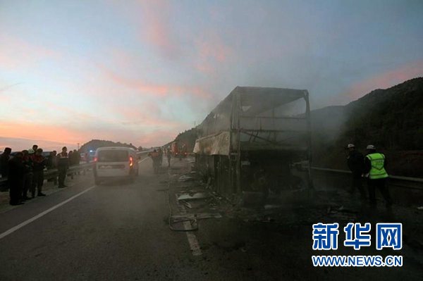 這是3月13日在土耳其喬魯姆省拍攝的被燒毀的大巴車。新華社發(fā)