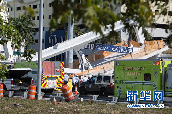 坍塌的天橋位于佛羅里達(dá)國(guó)際大學(xué)附近。該校當(dāng)天發(fā)布聲明,對(duì)這一悲劇事件表示震驚和悲痛,并說(shuō)校方與救援等有關(guān)部門人員正在現(xiàn)場(chǎng)展開(kāi)工作。