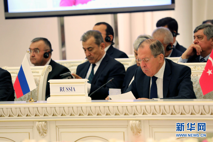 俄羅斯外長(zhǎng)拉夫羅夫(前排右一)出席會(huì)議。阿富汗問題高級(jí)別會(huì)議27日在烏茲別克斯坦首都塔什干舉行。新華社記者周良攝